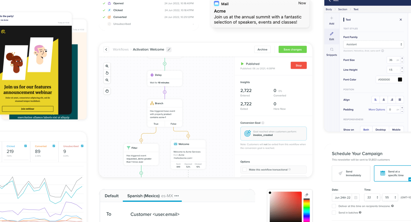 Trigger workflows based on customer activity, automate decisions and send messages across multiple channels, all using a visual UI.