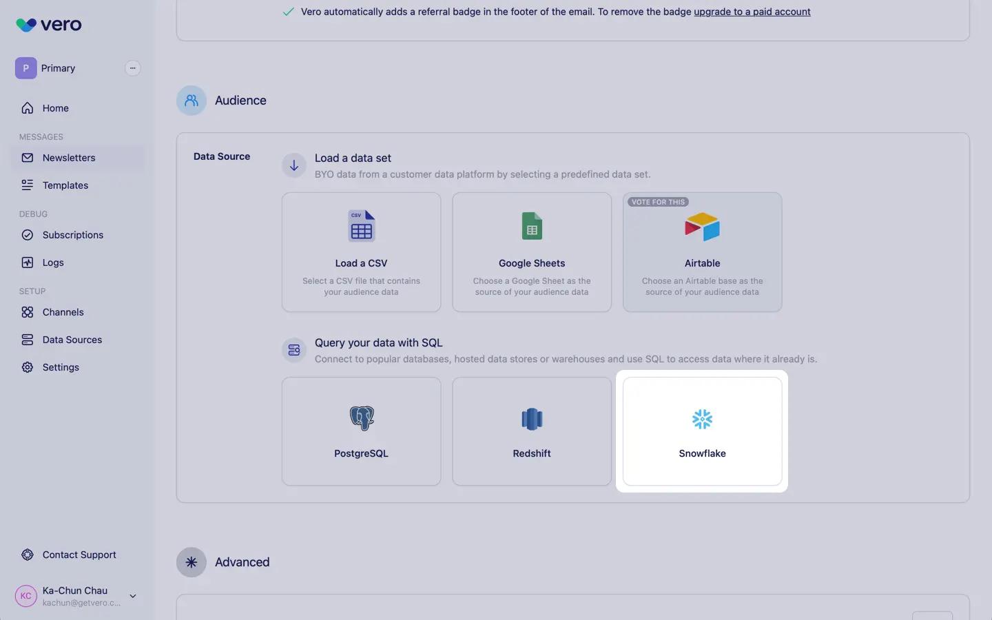 Fast moving teams will appreciate the simplicity of sending messages with Vero Connect. Simply connect to your Snowflake database, define your audience, write your content and hit send. It's as simple as that. Vero Connect provides the tools you need to send great messages quickly and without the fuss and frustration of copying and syncing data between customer data platforms and marketing platforms.