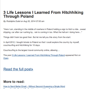 Buffer has several blogs, and several newsletters as a result. Their popular Social blog delivers a new article on social media marketing each morning. The Open blog matches the frequency but focuses on productivity, happiness and Buffer culture. Social Sample / Social Subscribe Open Sample / Open Subscribe