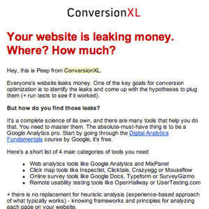 ConversionXL’s article are always massive in both length and value. The newsletter is exactly what you might expect from Peep Laja and Tommy Walker … in-depth articles absolutely loaded with actionable tips.