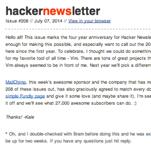 Kale Davis has been curating the best stories from Hacker News for four years. More than 27,000 subscribers get his weekly update which regularly includes 40 or more articles.