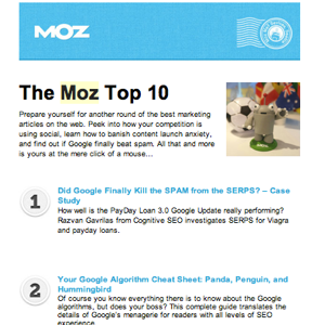As one of the most respected sources of SEO resources out there, you would expect that Moz’s monthly newsletter would be highly valuable. And it is. They curate content from their own blog as well as a handful of other smart resources. It’s a case study on how to send a useful newsletter.