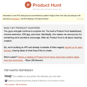 Product Hunt is less than a year old but is taking the web by storm. It started as a daily newsletter of new apps, tools and products that has evolved into a popular website and mobile app. It’s daily new update is habit-forming (on purpose).