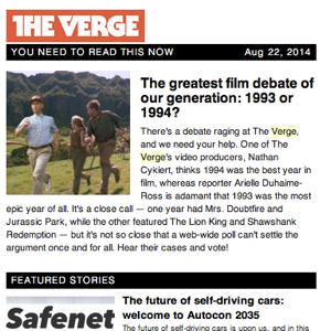 The Verge stands out in the crowded tech news space by offering smart content, a beautiful design and an ensemble of talented writers. The newsletter is an extension of that, containing links to their best content on a daily basis.