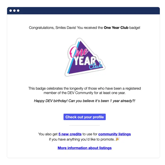 The first way to incorporate anniversary emails to customers is by acknowledging when they became a customer. DEV.to celebrates a subscriber’s first anniversary by awarding them a “one year club” badge.