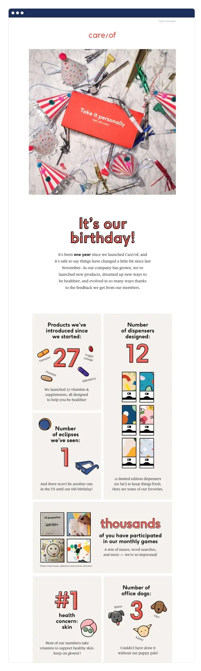 Why should customers get to have all of the fun—your company has a birthday, too! Care/of created an anniversary email for their company’s first birthday to acknowledge their progress and thank the community.
