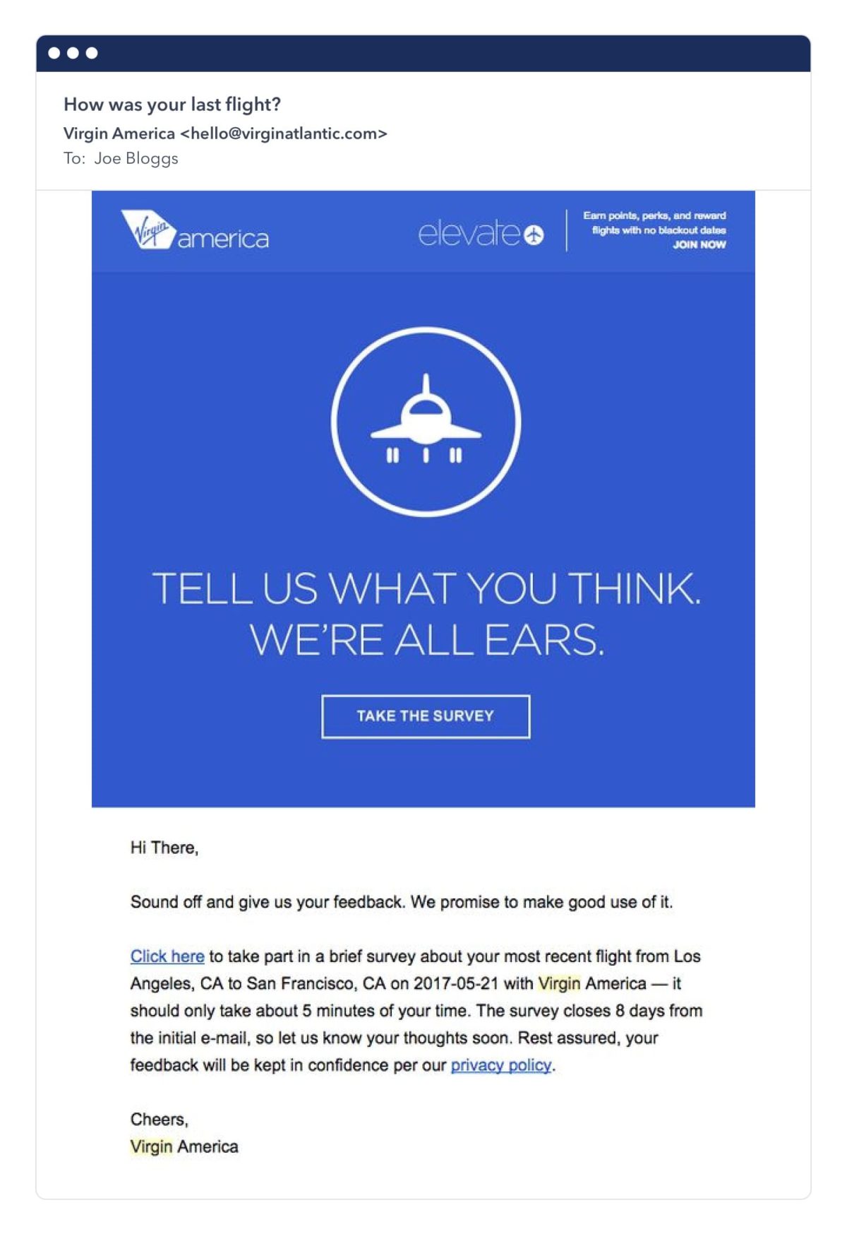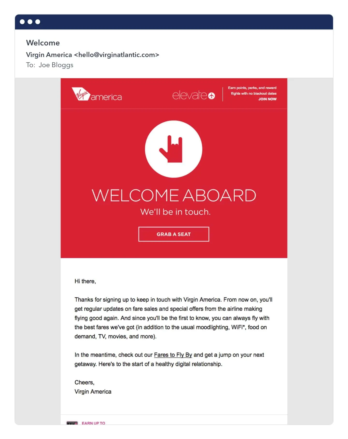 Below is an example of Virgin America‘s targeted emails, as it welcomes new subscribers.