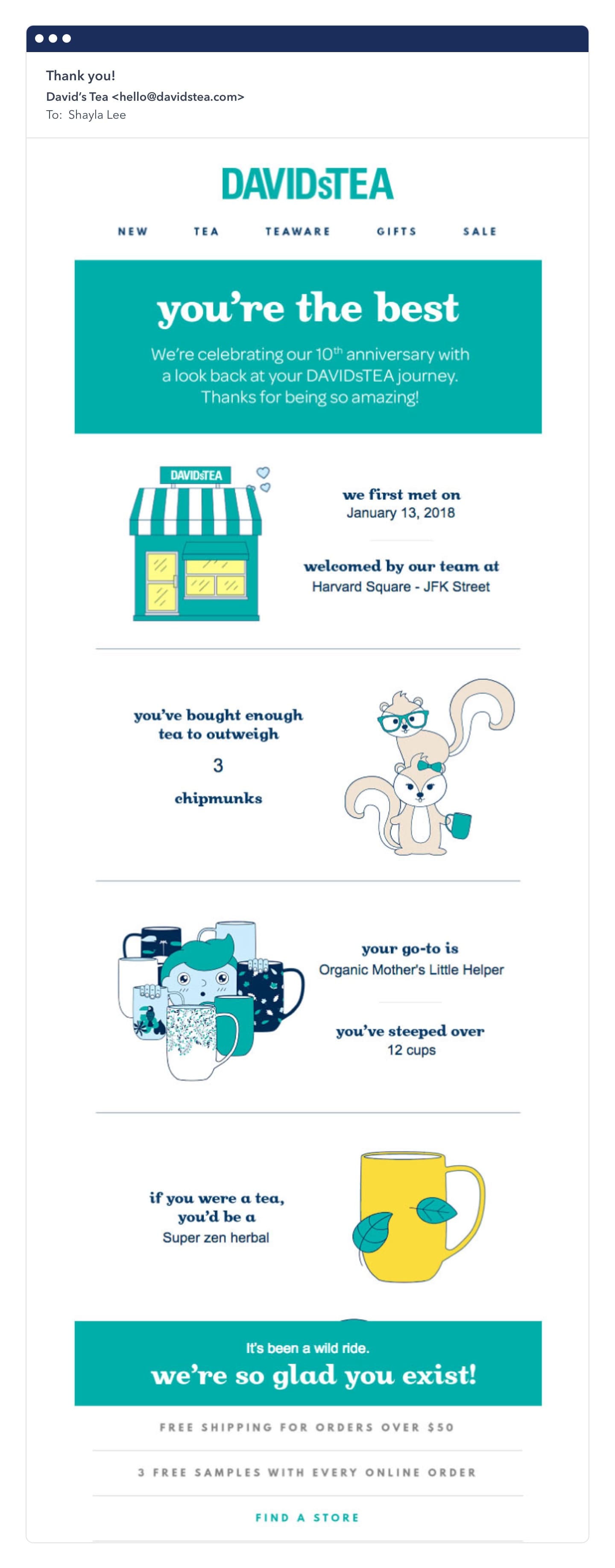 A simple example is to send a thank you email to customers that have been with you for a certain amount of time. This kind of recognition feels good, and can go a long way!