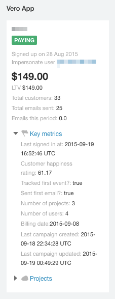 This little sidebar tells us a lot. It tells us whether the customer is paying, when they last interacted with Vero, how engaged they are (that’s our homegrown Customer Happiness Index – above 60 is good), how much they’re paying, when they paid, email campaign activity and so on.