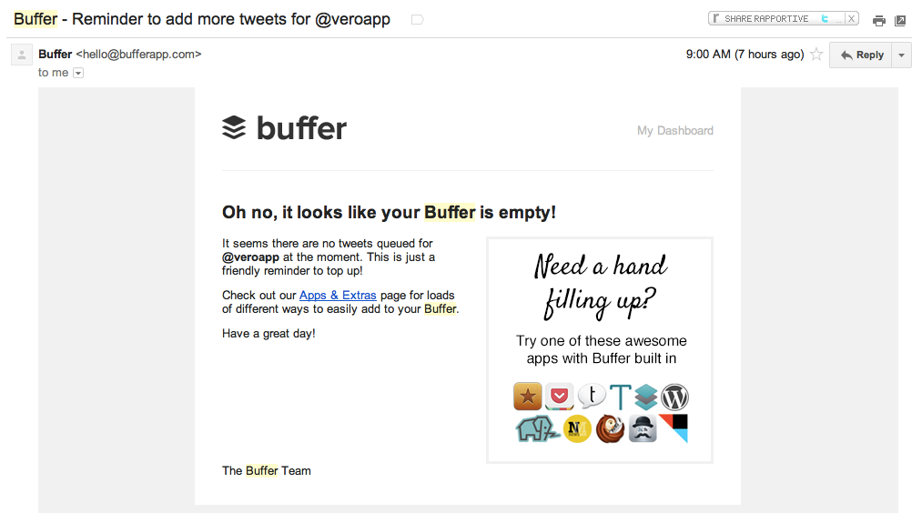 Buffer use email marketing to similar effect, giving you friendly nudges when your Buffers run out. Of course these emails are designed to increase engagement (and ultimately the chance that you’ll become a paying customer) but they’re successful because they actually help you, the customer. They give back by ensuring you keep your Buffer topped up. This is important as they key reason customers sign up to Buffer is to make it seem as though they are consistently tweeting great content. Ideally, these users don’t want their buffers to run out!