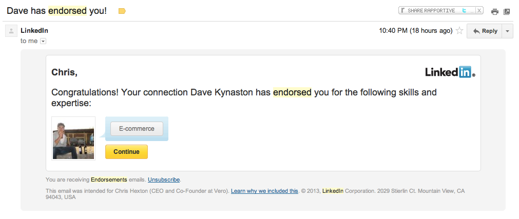 Take LinkedIn’s endorsement emails. These are a great example of positive re-enforcement that makes the recipient feel good.