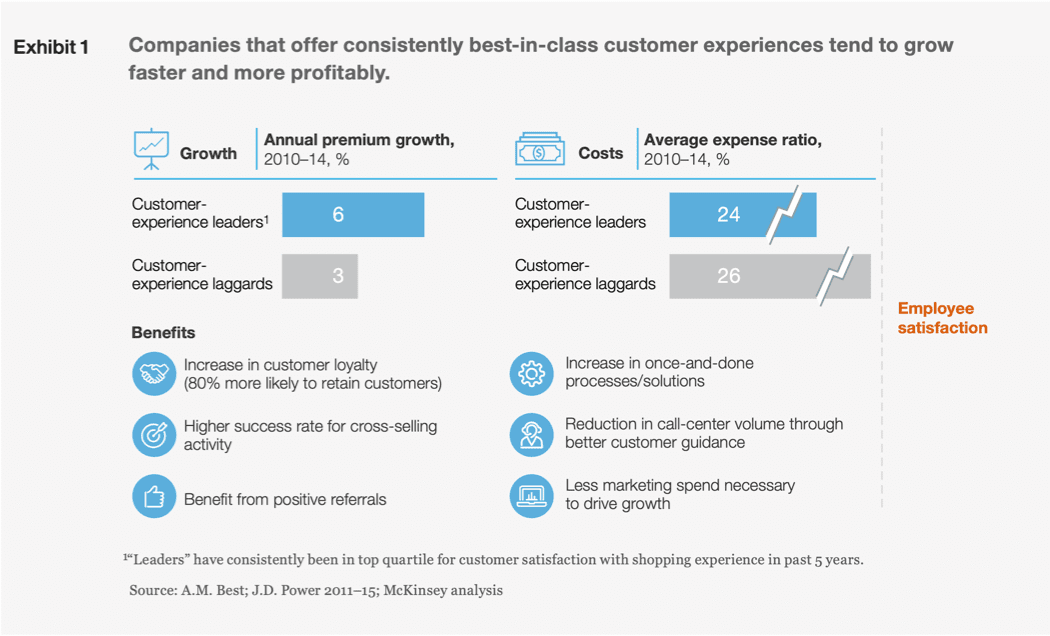 For example, U.S auto insurance carriers that provide customers with best-in-class experiences generate two to four times more growth and 30% higher profitability than those with an inconsistent customer focus.