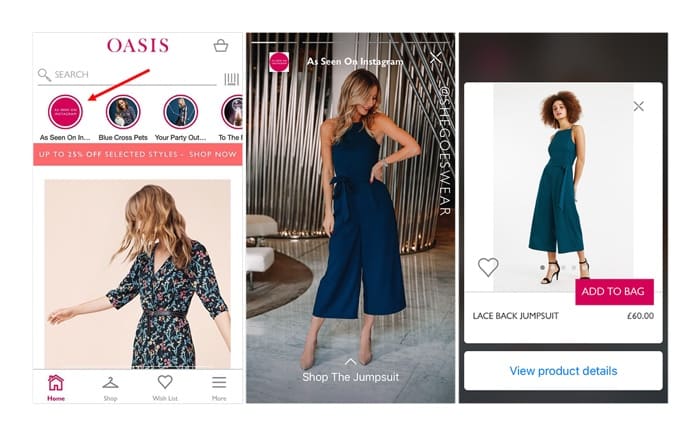 One retailer that’s doing a great job of creating an integrated customer experience is Oasis. As a fashion brand, they understand that a lot of their customers are on Instagram and so they give them the ability to make purchases on the app: