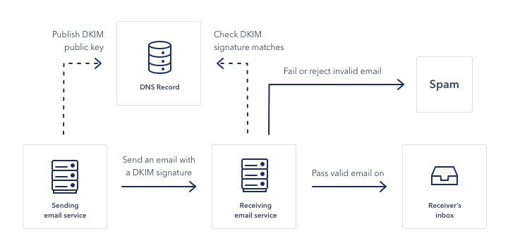 DKIM: It stands for Domain Keys Identified Mail. It’s another email authentication protocol that allows email receivers to verify that an email was sent, and authorized by the owner of that domain.