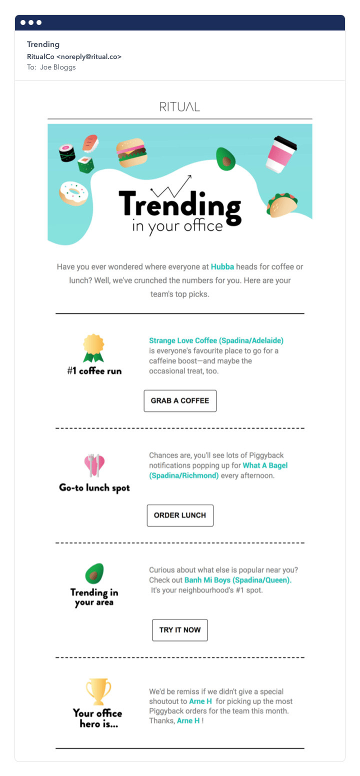 Ritual helps teams save time by ordering ahead and skipping long lunch line-ups. Ritual is made for teams, and their email reflects this: