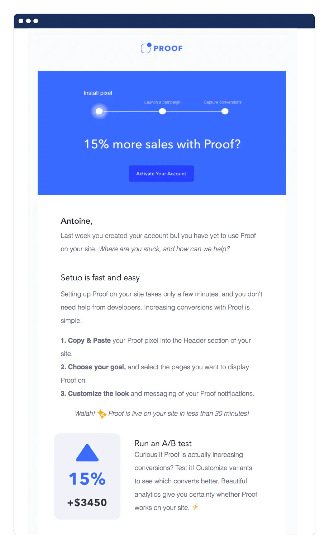 Proof uses a progress bar to illustrate where a user left off. The activation email isn’t judgemental or pushy. Instead, Proof asks how they can help. The company proceeds to explain how to connect accounts, and what results the customer can expect.