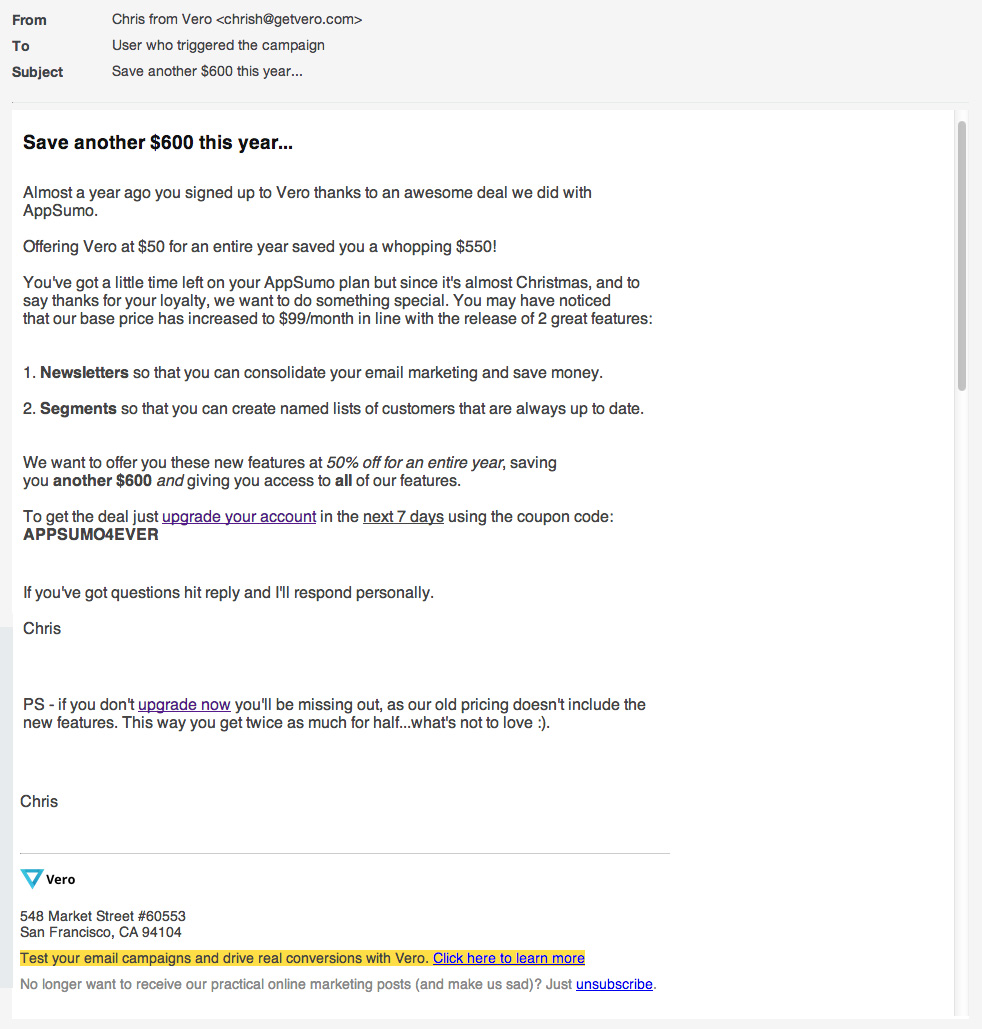 After analysing the customers in newly created segment, we knew that many sent relatively small volumes and were SaaS businesses just like us. We also knew (from communicating with these great customers over the last year) that many got a lot of value from Vero. We hypothesised that these customers would appreciate access to the new features at a reduced price and would therefore upgrade a month or two early, particularly if it meant they saved money in the long run.