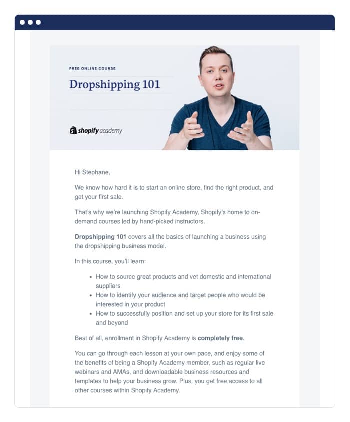 Shopify does an excellent job of producing and sharing content that’s adjacent to their product. Their content email highlights a free “Dropshipping 101” class, which an entrepreneurial user might find useful.