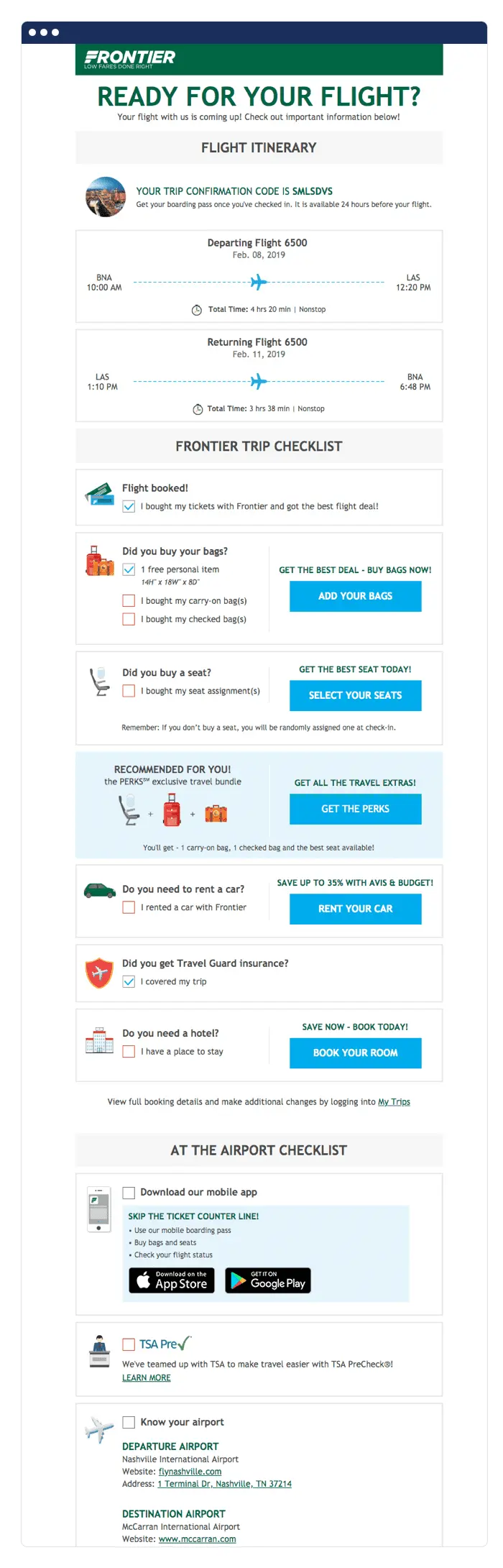 When customers have an event coming up. The types of events or milestones your customers have depend on your company, but you can use these turning points to present an upsell. For example, Frontier presents a checklist of upsells for customers about to take a trip. The email feels like content but also has upsell options. Other examples of events include anniversaries, project deadlines, or seasons.