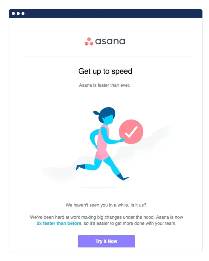 The Asana email below is a perfect example of an inactive subscriber retargeted email. The app recognized that the user hadn’t logged in, so a message was generated to remind them to log back in. To make the action more enticing, Asana shared that updates have been made to make using the app easier.