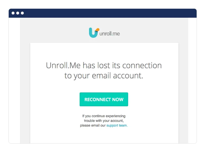 For Unroll.me, maintaining a connection to a user’s email address is vital to using the service. Therefore, they send an email when the connection has been lost. To start implementing retargeted emails for decreased user activity, start monitoring engagement with your most important features or tools.