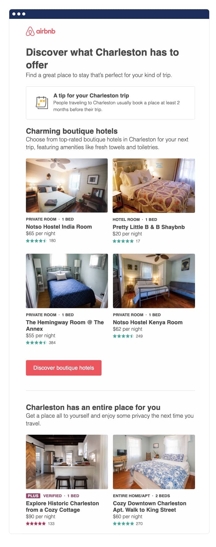 You don’t have to wait for users to begin the checkout process to use email retargeting. Sending emails based on browsing history is another touchpoint to add to your sales strategy. One of the most notable companies to use this strategy is Airbnb.