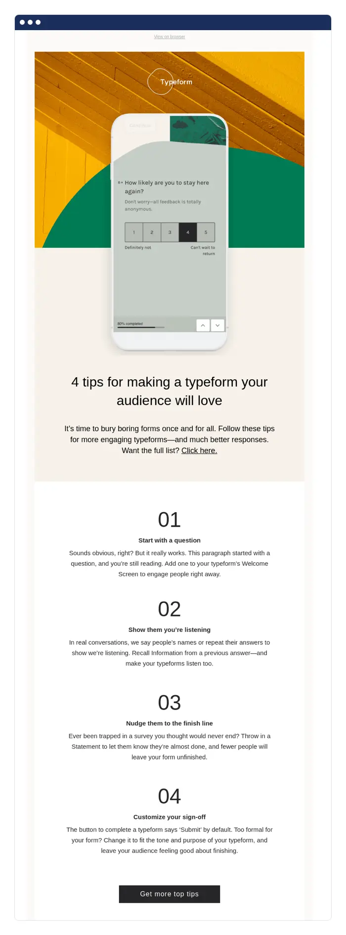 Typeform recognizes that while its tool is easy to use, users may still struggle with content. So, the company outlined four steps to create more engaging surveys. By repurposing blog content into an easy-to-read list, Typeform added value to new users and enticed them to read more on the blog.