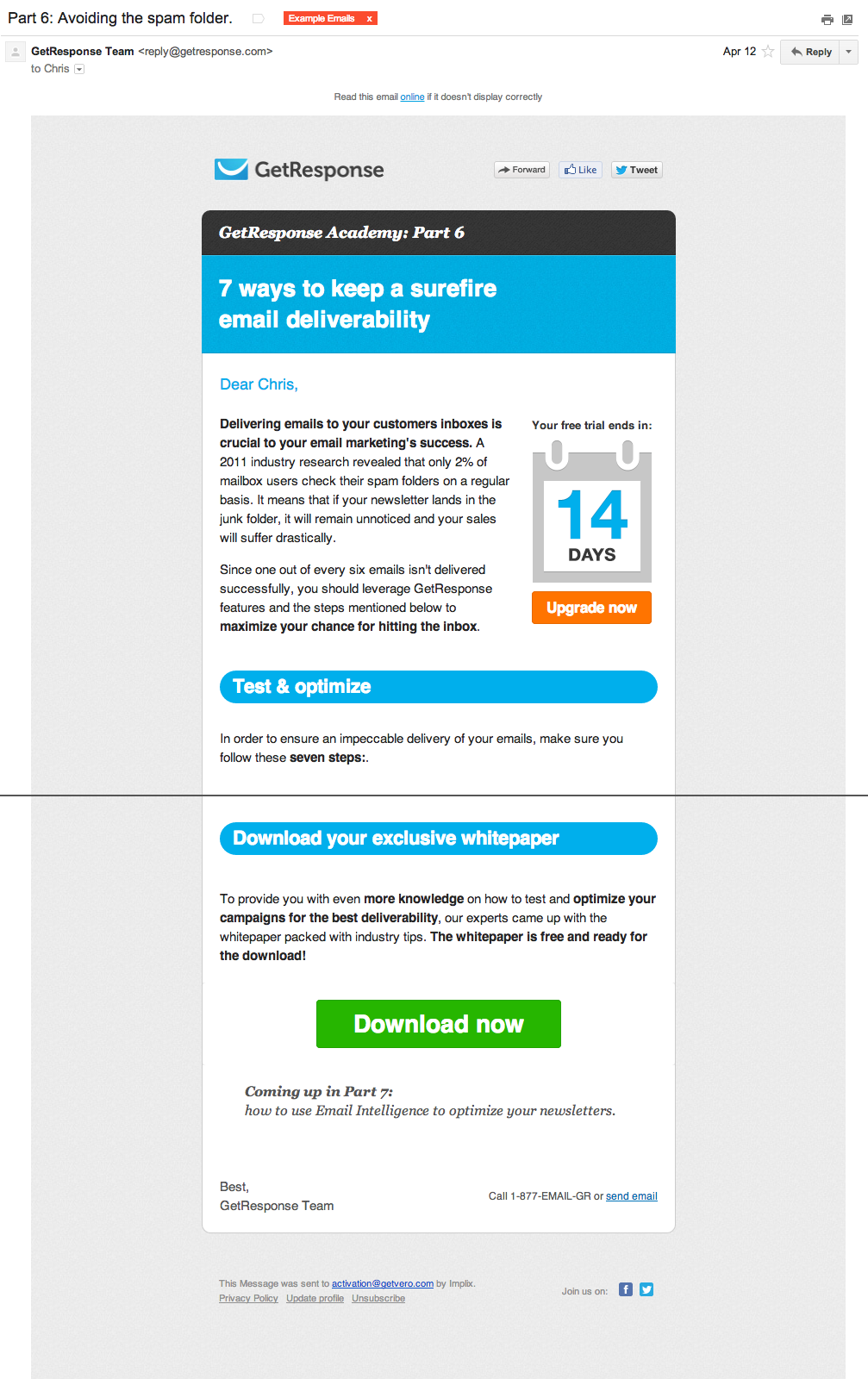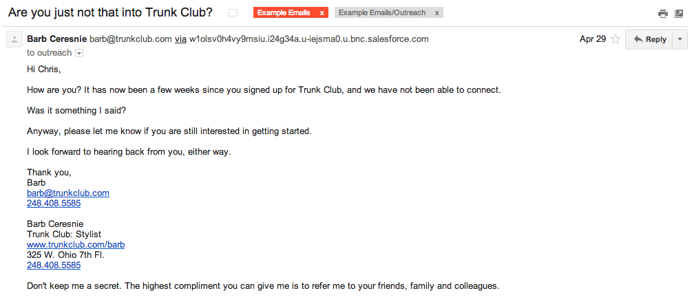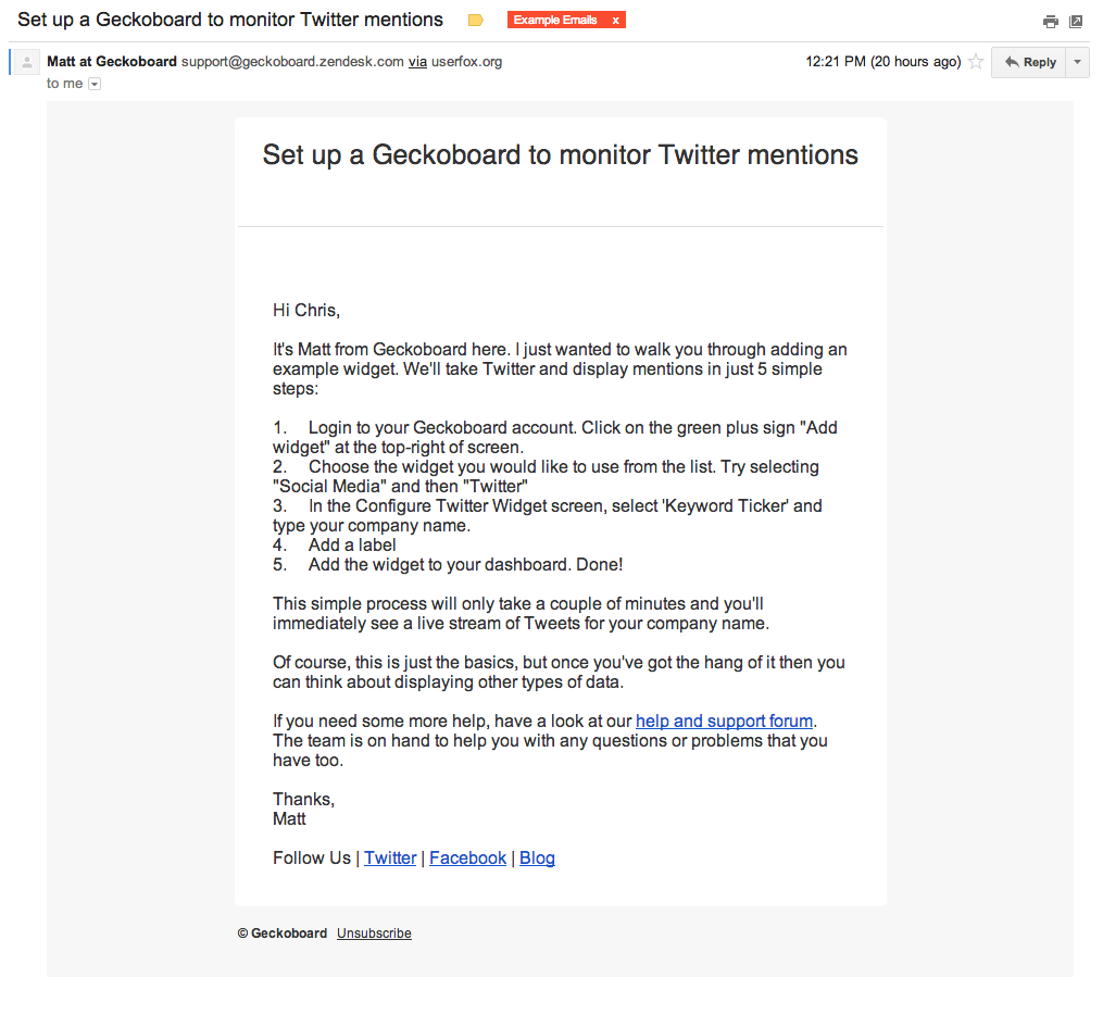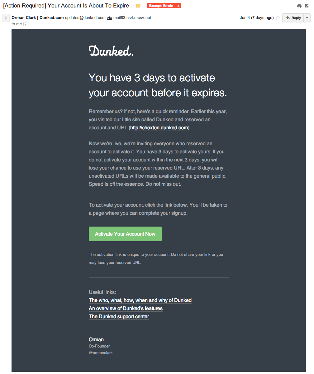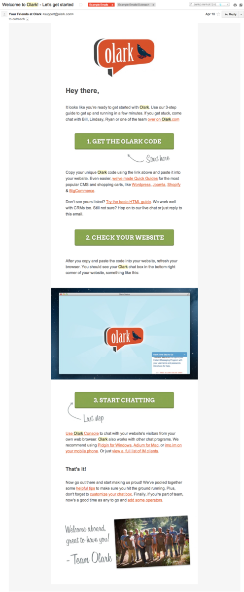 On top of the personal founder email you’re hopefully sending, you will no doubt be emailing new signups a welcome email to help them get started. This email from Olark is awesome: it has a great tone, really clear steps and is just plain fun. The finest example of a ‘Getting Started’ campaign we’ve seen.