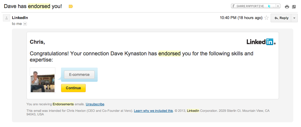 1. LinkedIn use calls to action that have a real focus on taking the next step. Take the email below. The copy on the call to action is ‘Continue’, which makes it seem like you have to take an action to actually get endorsed (which isn’t actually the case, as it’s already happened). Another good example is the copy ‘Confirm you know Dave’ which you’ll see in emails when you are invited to LinkedIn. This is much more positive than the more standard copy ‘Sign up to LinkedIn’.