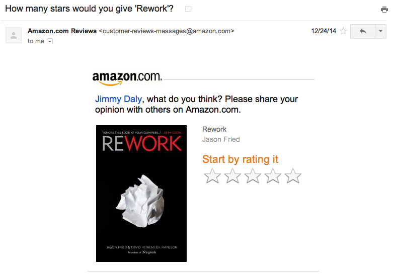 You should automate campaigns at each stage of the customer lifecycle, urging your customers to take the next step. The example above from Amazon is a great one as it is transactional and it directly aims to get the customer purchasing again and/or referring others (great reviews mean more book sales from other potential customers).