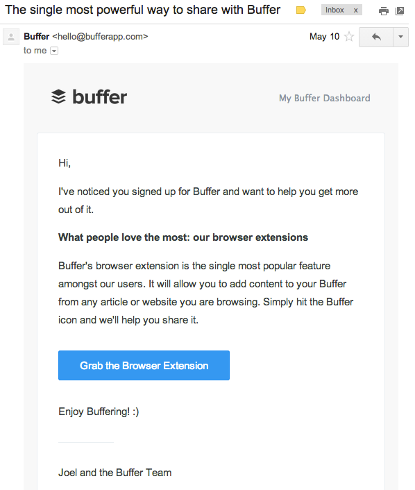 On the contrary, this lifecycle email from Buffer is fantastic, and it has no images. In fact, images wouldn’t help the customer achieve the end goal.