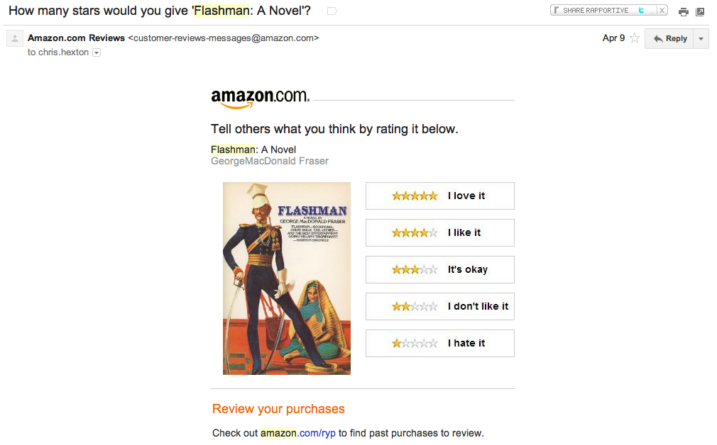 Rather than using a button that says “Rate this book” and getting the customer to click-through and do the rating on-site, Amazon ups the ante and makes the call to action more actionable using a series of links lead to direct ratings of the book in question.