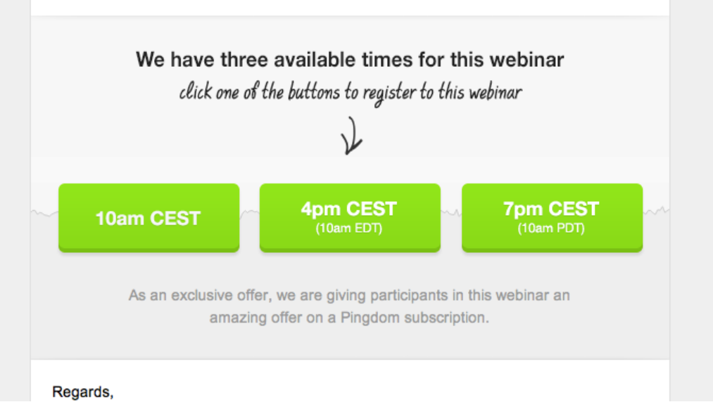 A no brainer, big buttons with a lot of color can really help your email conversions. A great example of this in practice is to check out these fluoro green buttons from Pingdom.