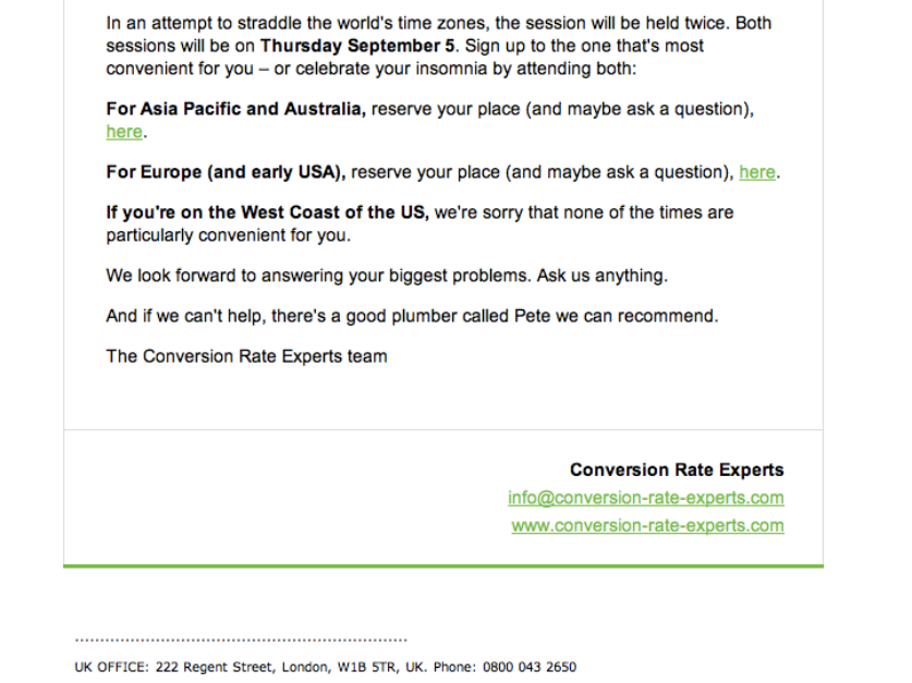 Here’s a great example from a webinar invitation. Although this email uses long-form sales copy, the email repeats the call to action (using different wording) toward the bottom of the email.