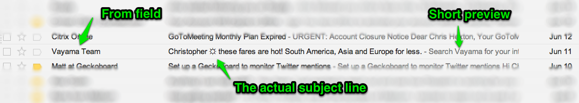 We like to call this the modern subject line. It has three components: the ‘from address’, the actual subject line and the first few lines of the email.