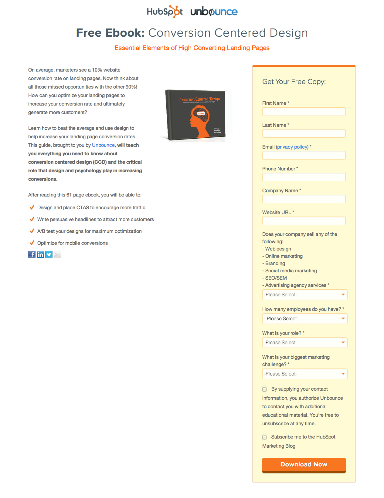 The following example comes from HubSpot and Unbounce who put together a resource called ”Conversion Centered Design”.