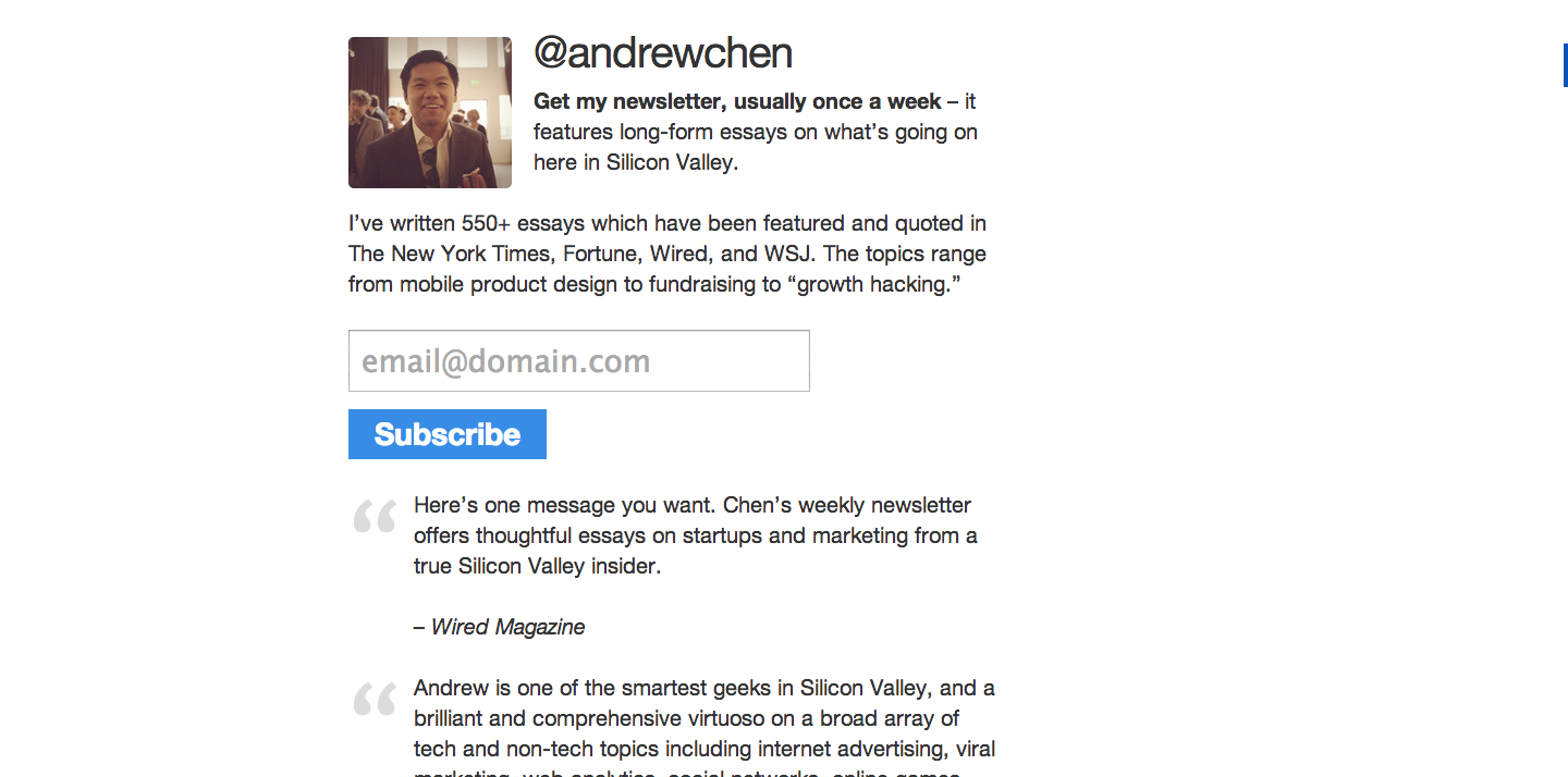 Andrew Chen and Gregory Ciotti use full-page interstitial popups to target customers that come directly to their blog home pages from Google.