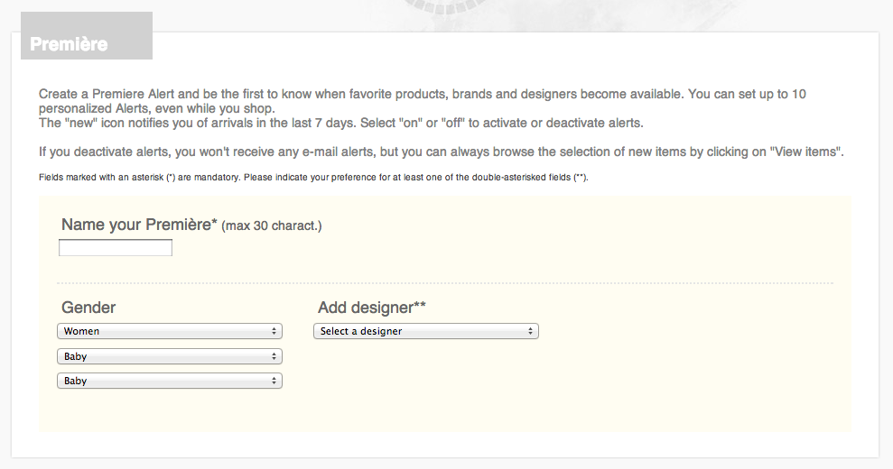 You could go even further and give your customers the option to get notifications based on specific properties or products they have selected. This sort of personalization is attractive to new subscribers as it gives them the comfort they’re going to be sent emails that matter to them. The following example is from European retailer Yoox. It’s an extremely detailed tool (on the complex end of the spectrum) but it certainly gives the customer trust that they’re going to get relevant updates!