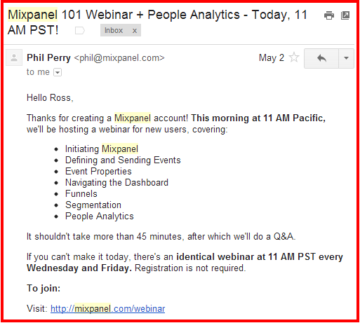Mixpanel does a great job of staying in contact with their customers using email. I signed up for Mixpanel in May and since then I’ve received four emails from them. The first email was a helpful getting started checklist. The second was a personal invite to attend their latest webinar. The third email was another personal email from Will (the Solutions Architect at Mixpanel) and, most recently, they emailed me a quick feature update with some of their latest announcements.
