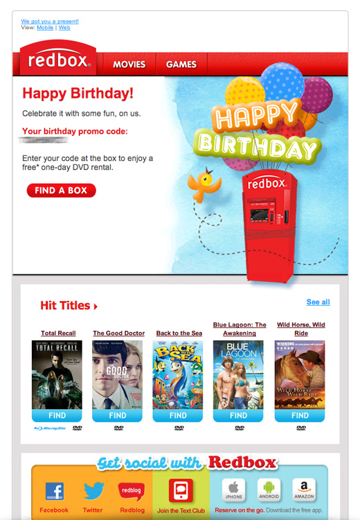 Redbox runs a great birthday email campaign. They send a simple email with an offer for a free one-day DVD rental. Check it out below and see more birthday email examples here.