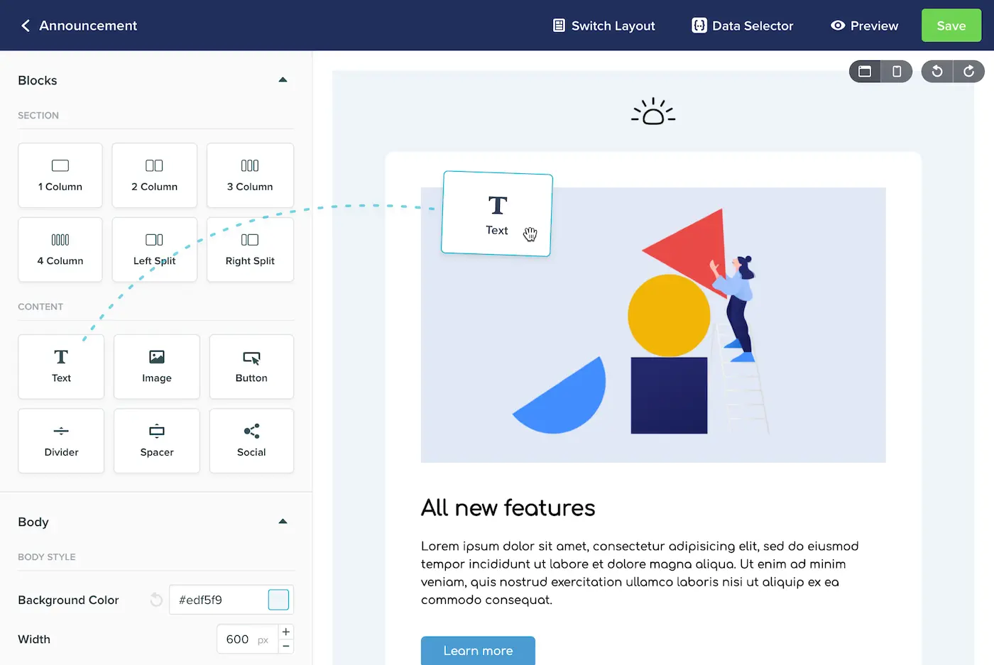 It’s an exciting day! We’re pleased to announce our first major release of the Drag and Drop editor. It’s a feature that we believe will transform the way you design, build, and edit responsive email templates.