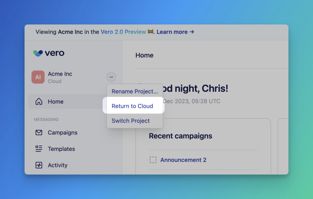 As of today, you can switch to the new Vero 2.0 interface from any existing Vero Cloud (which we’ll refer to as "Vero 1.0" going forward) project. Vero 2.0 is not just a glimpse into the future but a fully functional product, allowing you to send messages right away.
