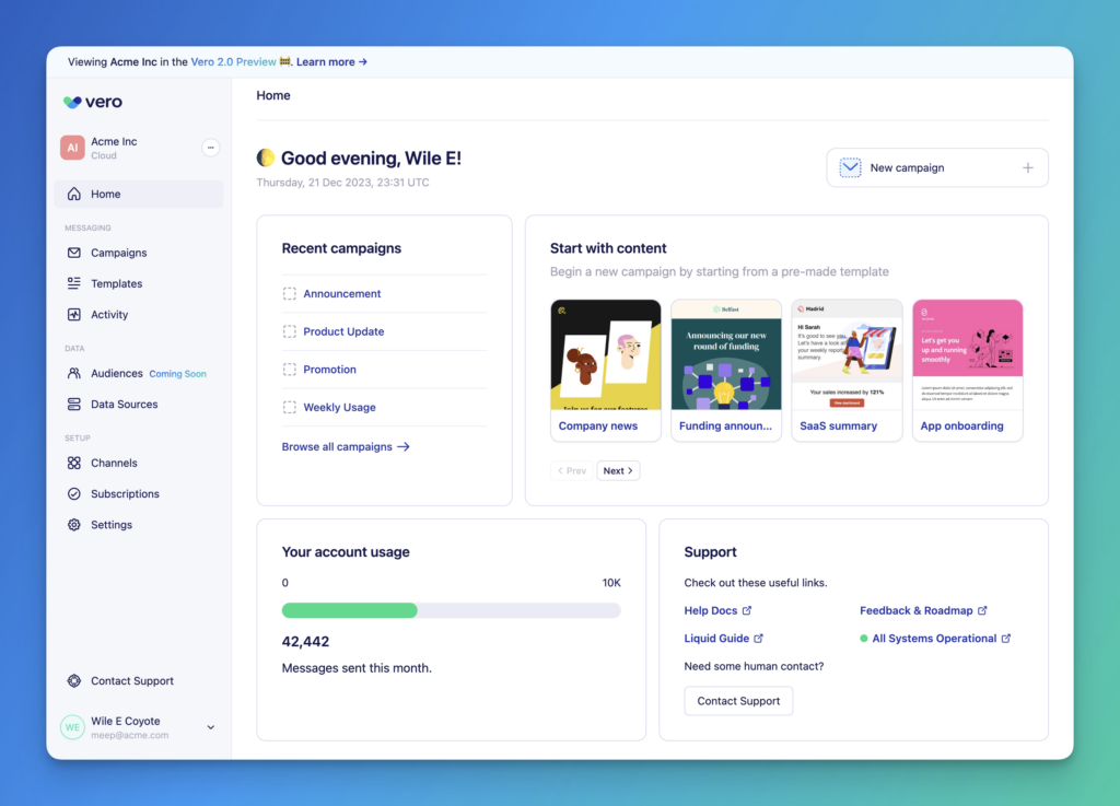 We’re super excited about Vero 2.0 and envision a future where all customers seamlessly transition to this new interface. Your feedback is crucial, so please share your thoughts with us at support@getvero.com or chris@getvero.com.