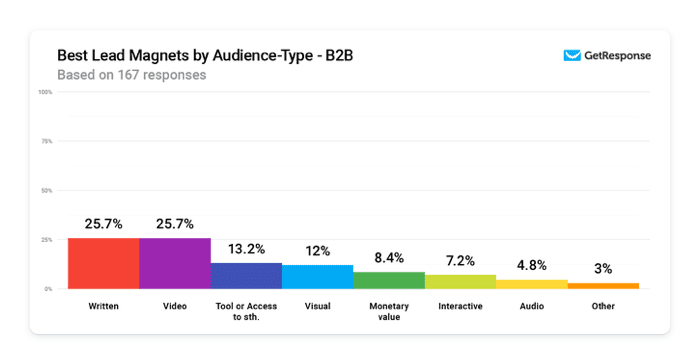 At this point in the process, you’ll nail down the exact lead magnets and tactics you’ll use in your lead generation strategies. A recent GetResponse study found that companies in different industries and growth stages prefer various types of lead magnets.