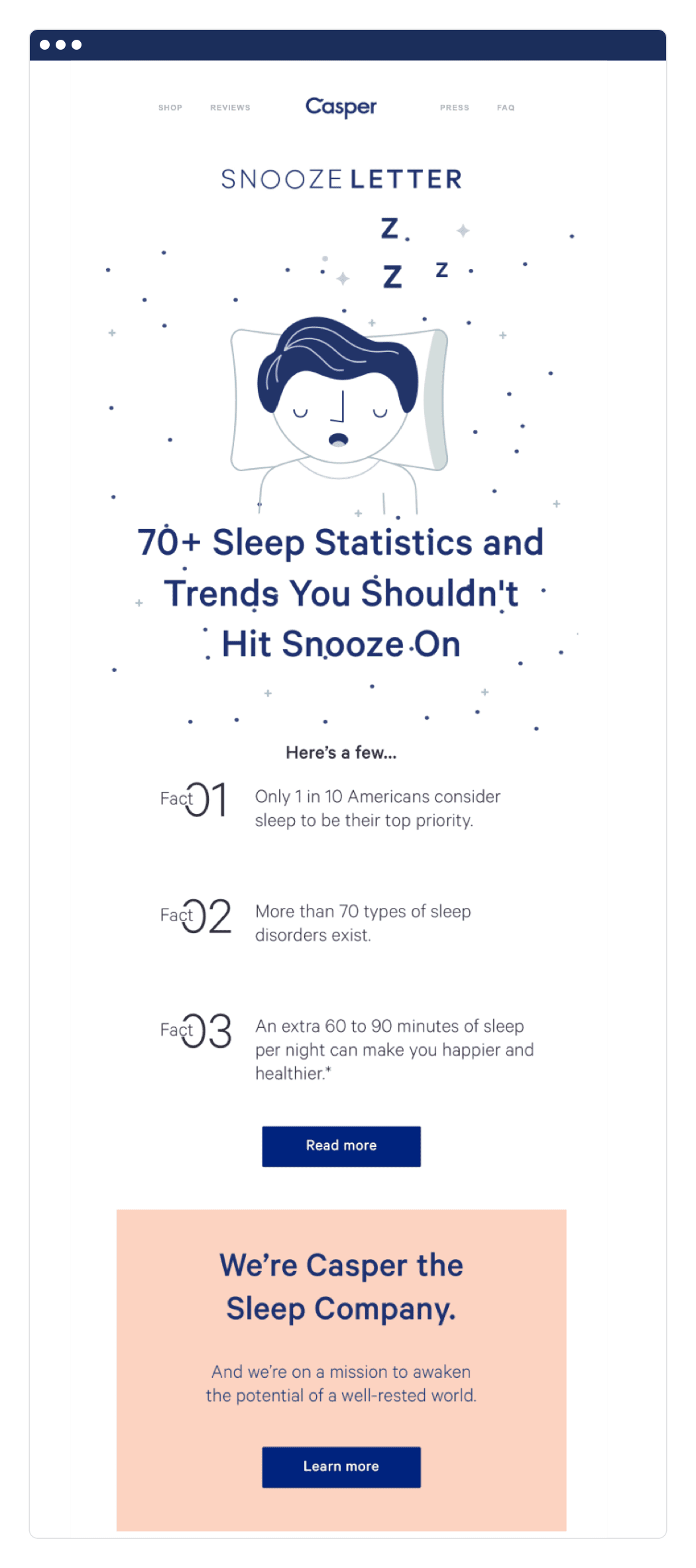 If your prospects aren’t entirely sold on your solution or the importance of the product at hand, you can take an approach like Casper did. The email below has a few enticing stats about the state of sleepers along with a CTA to read more about the issue. Casper also takes the time to highlight their mission, which can help build a brand connection.