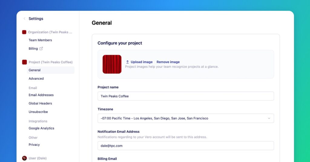 You can now manage your settings in the new Vero 2.0 UI. This new UI brings a better more organised way to view, add and update team members, improved customization via project and profile images, and includes some of the most common advanced settings into the Vero 2.0 UI.