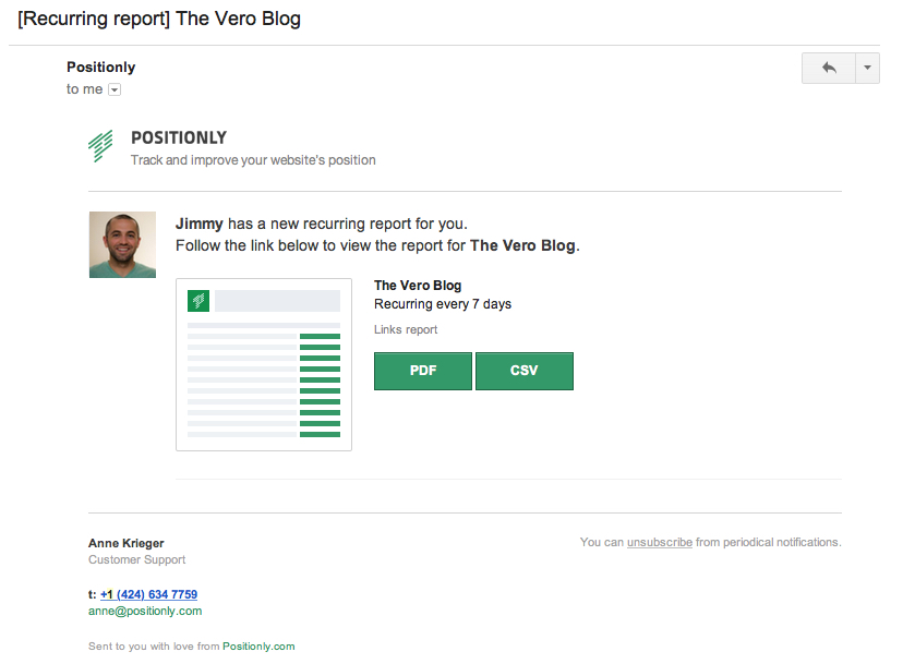 Positionly runs the reports as requested, exports the data into a PDF and CSV, and attaches the files to an email1. They don’t beg users to opt into emails. Instead, they make an email so valuable that their customers want them.