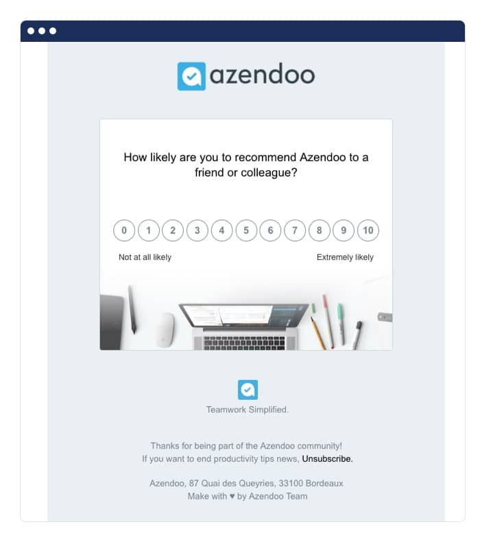 Who should you send a referral email to? Azendoo takes the approach of gauging net promoter scores first. By asking how likely a customer is to recommend the company to a friend or colleague, they can find the users who would be most likely to pass along a referral offer.