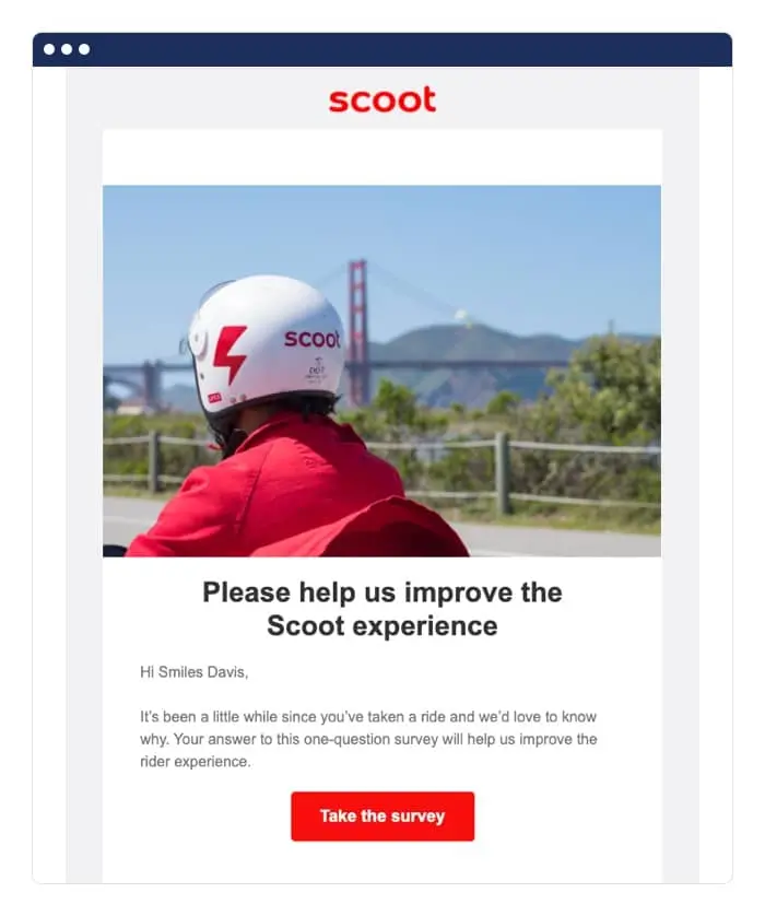 It’s nearly impossible to make improvements if you don’t know where you’re falling short of customer expectations. Therefore, collecting user feedback is a vital component of your retention marketing plans. The email from Scoot below is a bit of a feedback and winback combo.