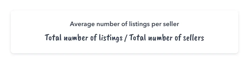 Similar to gauging repeat purchases from buyers, you also want to measure repeat listings from sellers. The average number of listings per seller helps you establish a baseline to compare seller activity to.